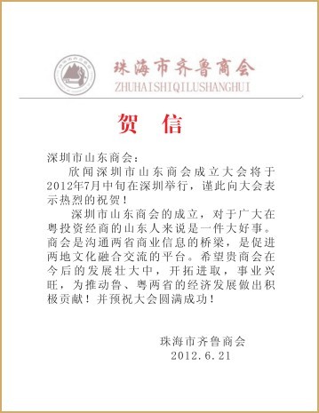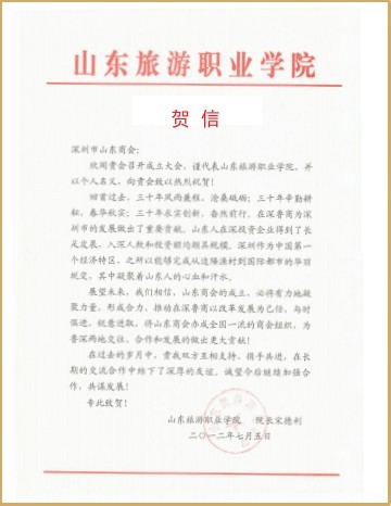 珠海齊魯商會賀信 山東旅游職業(yè)學(xué)校賀信