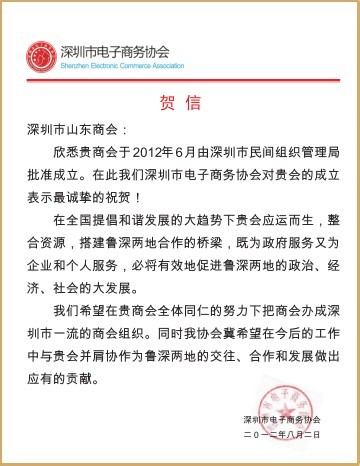 深圳市質(zhì)量協(xié)會賀信 深圳市電子商務(wù)協(xié)會賀信