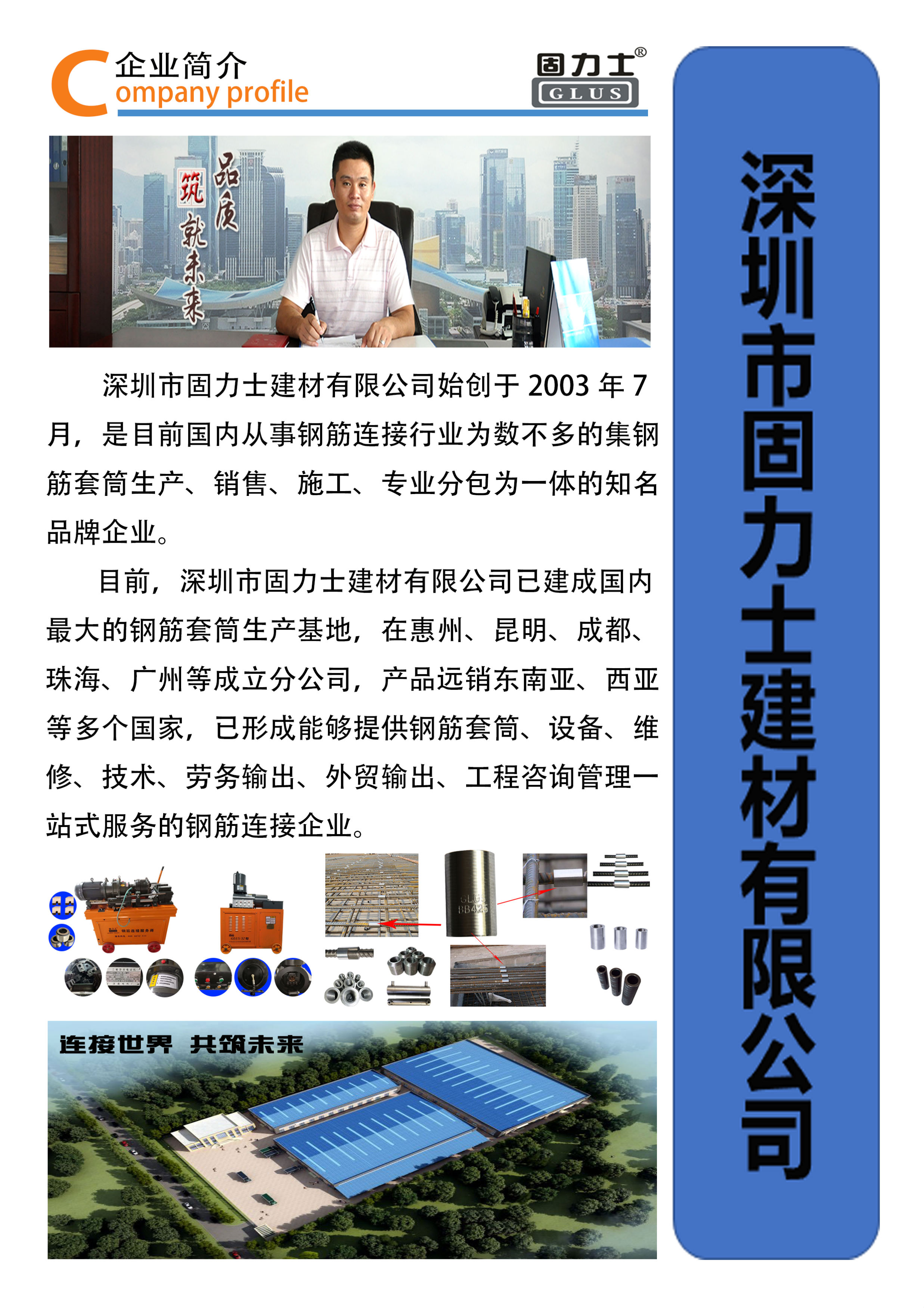深圳市固力士建材有限公司始創(chuàng)于2003年7月,是目前國內(nèi)從事鋼筋連接行業(yè)為數(shù)不多的集鋼!筋套筒生產(chǎn)、銷售、施工、專業(yè)分包為一體的知名品牌企業(yè)。