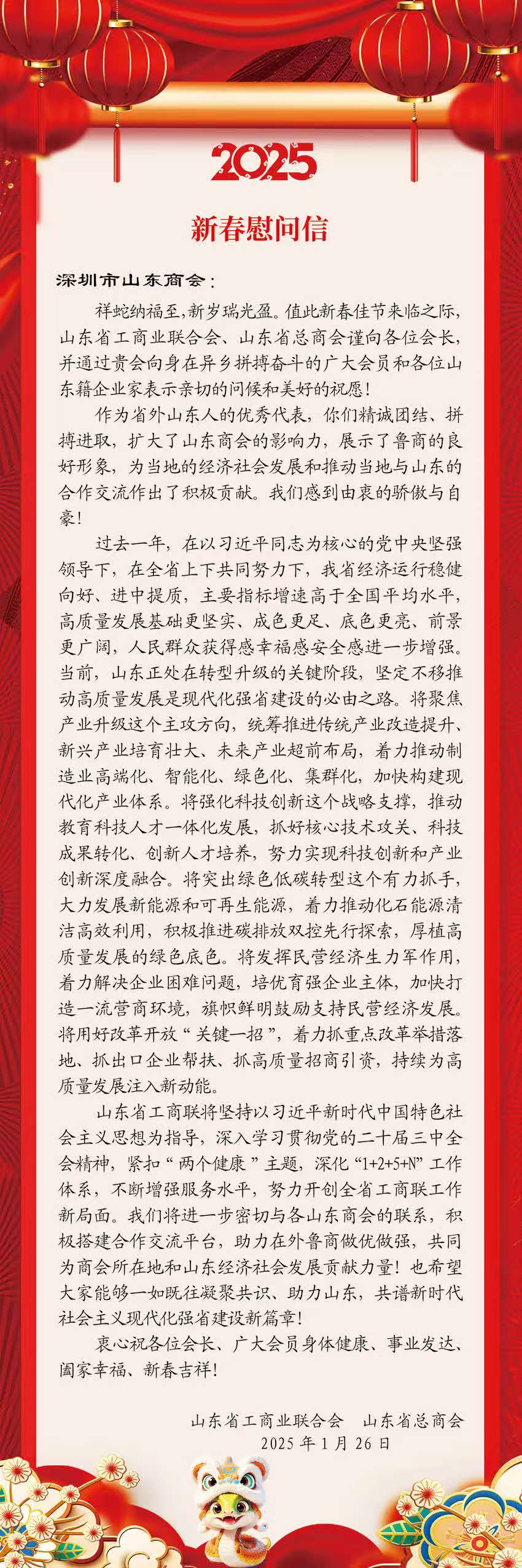 【新春賀詞】深圳市山東商會(huì)恭祝您:新春吉祥、巳巳如意、闔家團(tuán)圓、喜見升卿