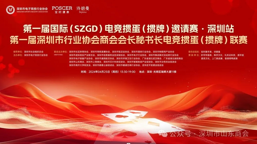 本次賽事由深圳市社會組織總會指導,深圳市電子競技行業(yè)協(xié)會主辦,深圳市山東商會、深圳市飯店業(yè)協(xié)會、深圳市酒類行業(yè)協(xié)會、深圳市物聯(lián)網(wǎng)產(chǎn)業(yè)協(xié)會、深圳市電子行業(yè)協(xié)會等商協(xié)會聯(lián)合主辦。
