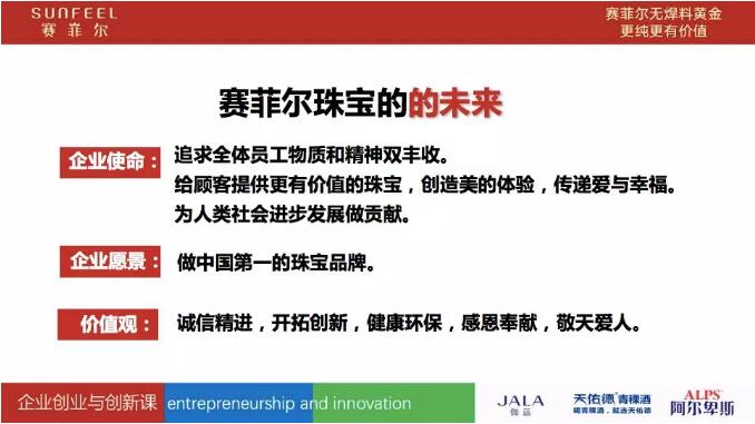 因此賽菲爾珠寶的未來和企業(yè)使命就是追求全體員工物質(zhì)和精神雙豐收。給顧客提供更有價值的珠寶,創(chuàng)造美的體驗,傳遞愛與幸福。為人類社會進(jìn)步發(fā)展做貢獻(xiàn)。賽菲爾將秉承著“誠信精進(jìn),開拓創(chuàng)新,健康環(huán)保,感恩奉獻(xiàn),敬天愛人”的價值觀,爭做中國第一的珠寶品牌。