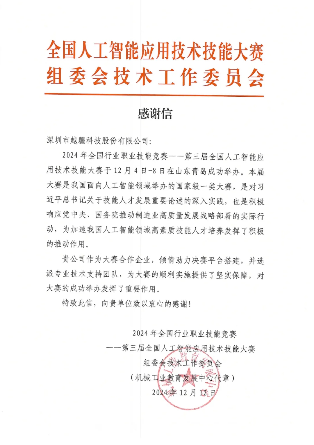 近日,我會副會長單位、越疆機器人收到了一封來自第三屆全國人工智能應用技術技能大賽組委會技術工作委員會的感謝信,對越疆機器人在此次大賽中提供的支持與貢獻表示衷心的感謝。這不僅是對越疆的一次肯定,也是對其在職業(yè)技能培訓領域所做努力的認可。