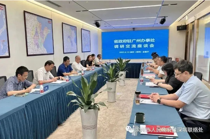 2023年6月12日,山東省政府駐廣州辦事處副主任劉風(fēng)俊一行到濱州市政府駐深圳聯(lián)絡(luò)處調(diào)研交流座談。