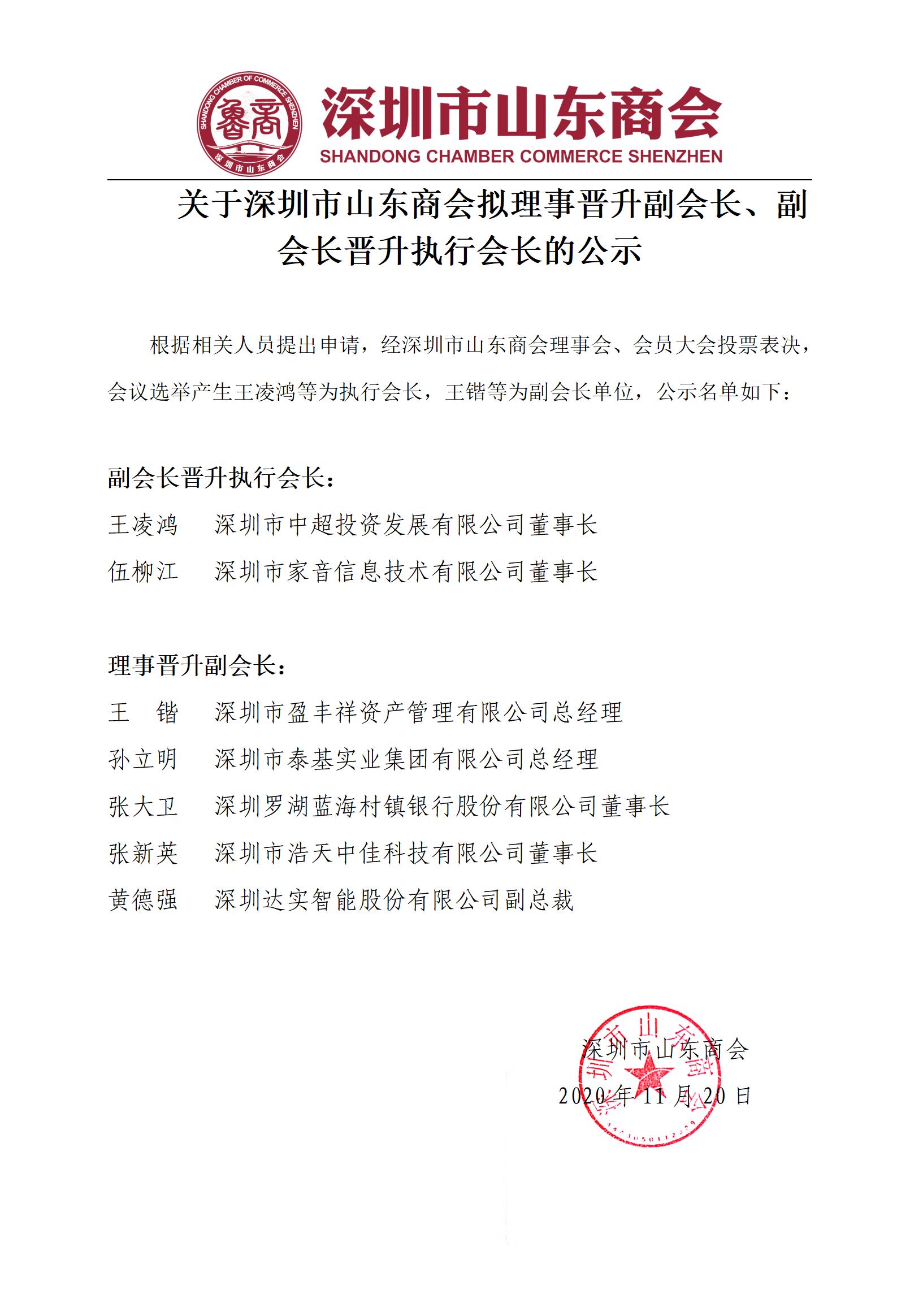 關(guān)于深圳市山東商會(huì)擬理事晉升副會(huì)長(zhǎng)、副會(huì)長(zhǎng)晉升執(zhí)行會(huì)長(zhǎng)的公示