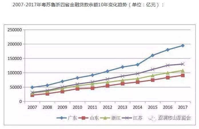 2007-2017年粵蘇魯浙四省金融貸款余額10年變化趨勢(單位:億元)