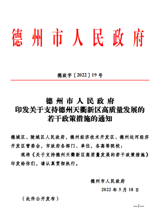 德州市人民政府印發(fā)關(guān)于支持 德州天衢新區(qū)高質(zhì)量發(fā)展的若干政策措施的通知