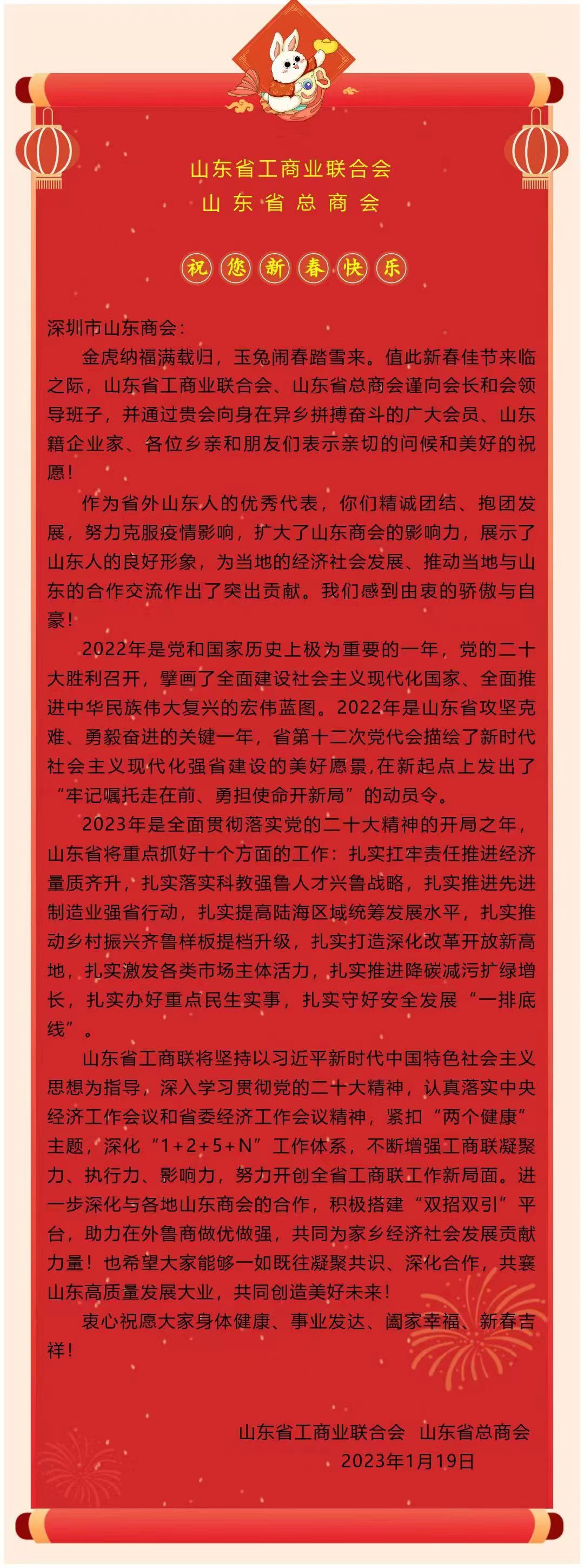 玉兔迎春百花艷,神州納福萬象新。值此2023年新春佳節(jié)來臨之際,我會收到山東省工商業(yè)聯(lián)合會的新春問候,向我會及廣大會員致以節(jié)日的問候和美好的新春祝愿!