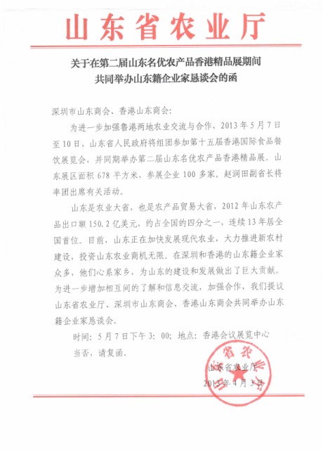 由我會與山東省農(nóng)業(yè)廳及香港山東商會共同舉辦的“山東名優(yōu)特農(nóng)副產(chǎn)品香港展”活動2013年5月7日在香港舉行。屆時趙潤田副省長率山東參展企業(yè)100多家出席。