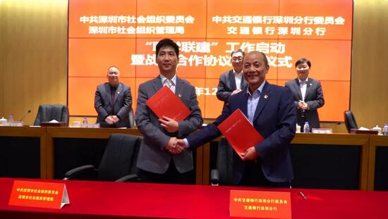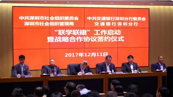 12月11日下午,為深入學習黨的十九大,貫徹落實全國、全省城市基層黨建工作座談會精神和深圳市委《關于推進城市基層黨建“標準+”模式的意見》部署要求,市社會組織黨委(市社會組織管理局)與交通銀行深圳分行黨委(交通銀行深圳分行)舉行“聯(lián)學聯(lián)建”簽約暨工作啟動儀式。