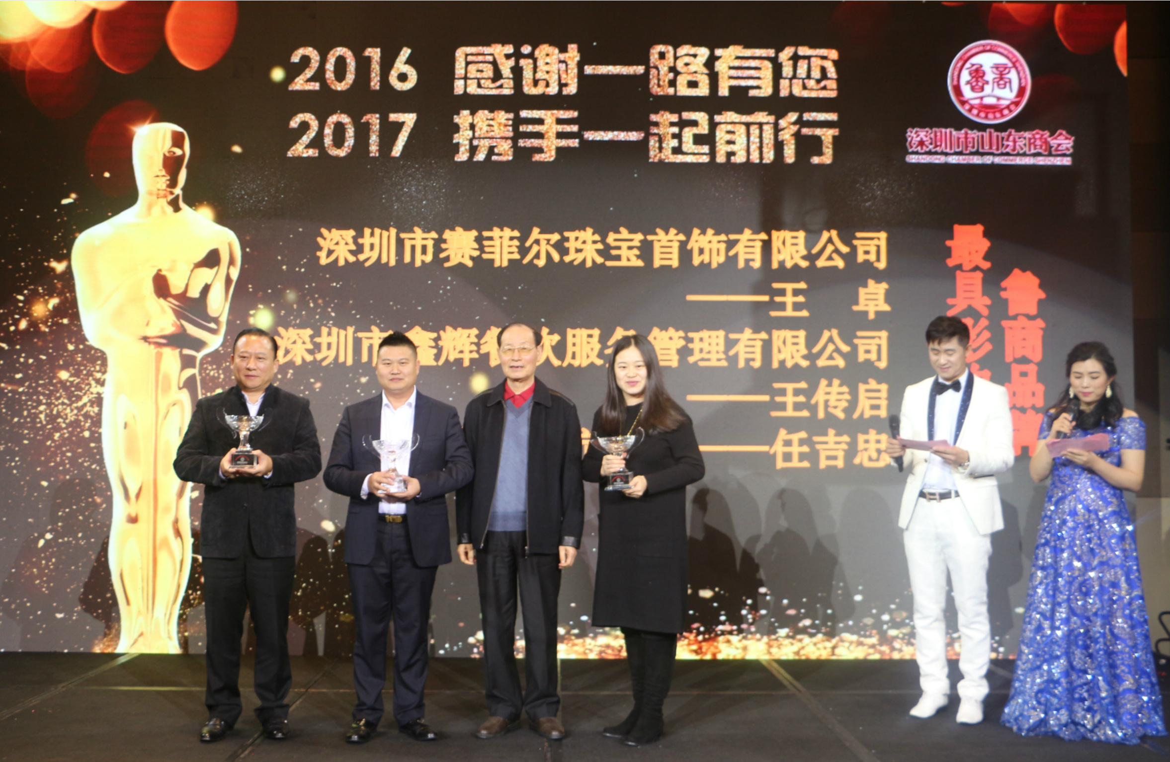 商會自成立以來,涌現(xiàn)出一批優(yōu)秀的企業(yè)和會員。商會為評先進,樹優(yōu)秀,立榜樣,在2016年度“評先樹優(yōu)”頒獎典禮環(huán)節(jié)中,原深圳市副市長、深圳市人大副主任郭榮俊先生為獲得“2016年度魯商品牌最具影響力獎”的深圳市賽菲爾珠寶首飾有限公司、深圳市鑫輝餐飲服務管理有限公司、愛維艾夫醫(yī)療集團頒發(fā)了獎杯。