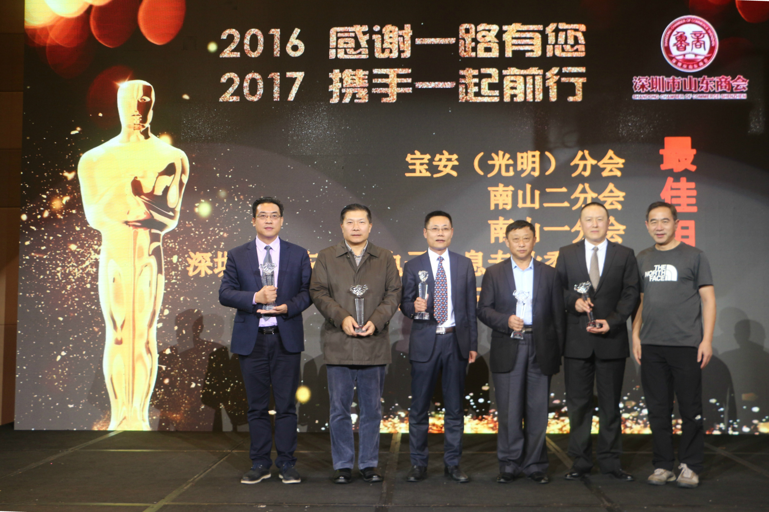 深圳市社會組織管理局副局長孫景明先生為“2016年度最佳組織獎”獲得者深圳市山東商會寶安區(qū)(光明)分會、深圳市山東商會南山區(qū)一分會、深圳市山東商會南山區(qū)二分會、深圳市山東商會電子信息專業(yè)委員會、深圳市山東商會微馬隊頒發(fā)獎杯。