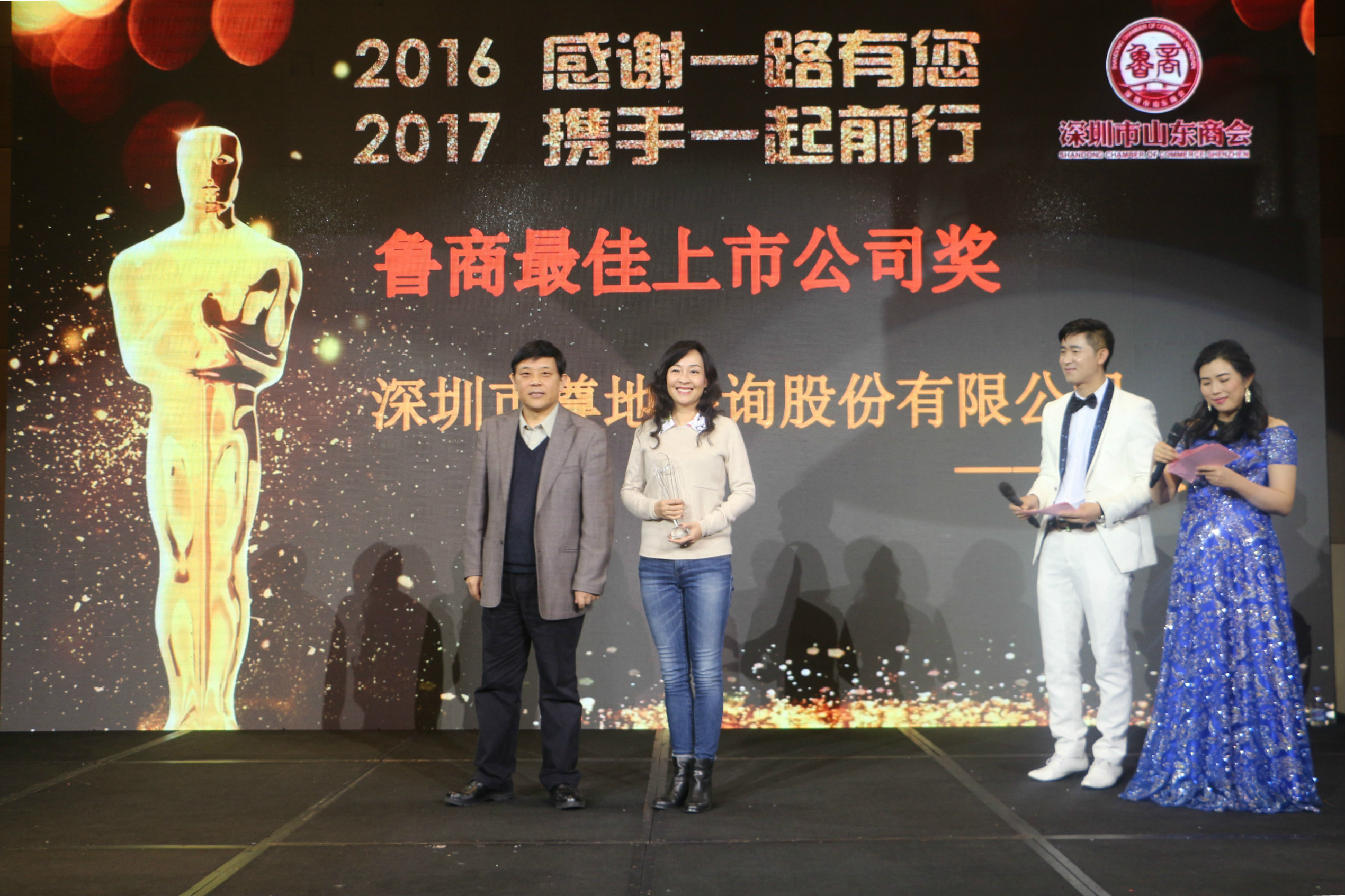 山東省人民政府駐深圳辦事處主任劉恒昌先生為“2016年度魯商最佳上市公司獎”獲得者深圳市尊地咨詢股份有限公司頒發(fā)了獎杯。
