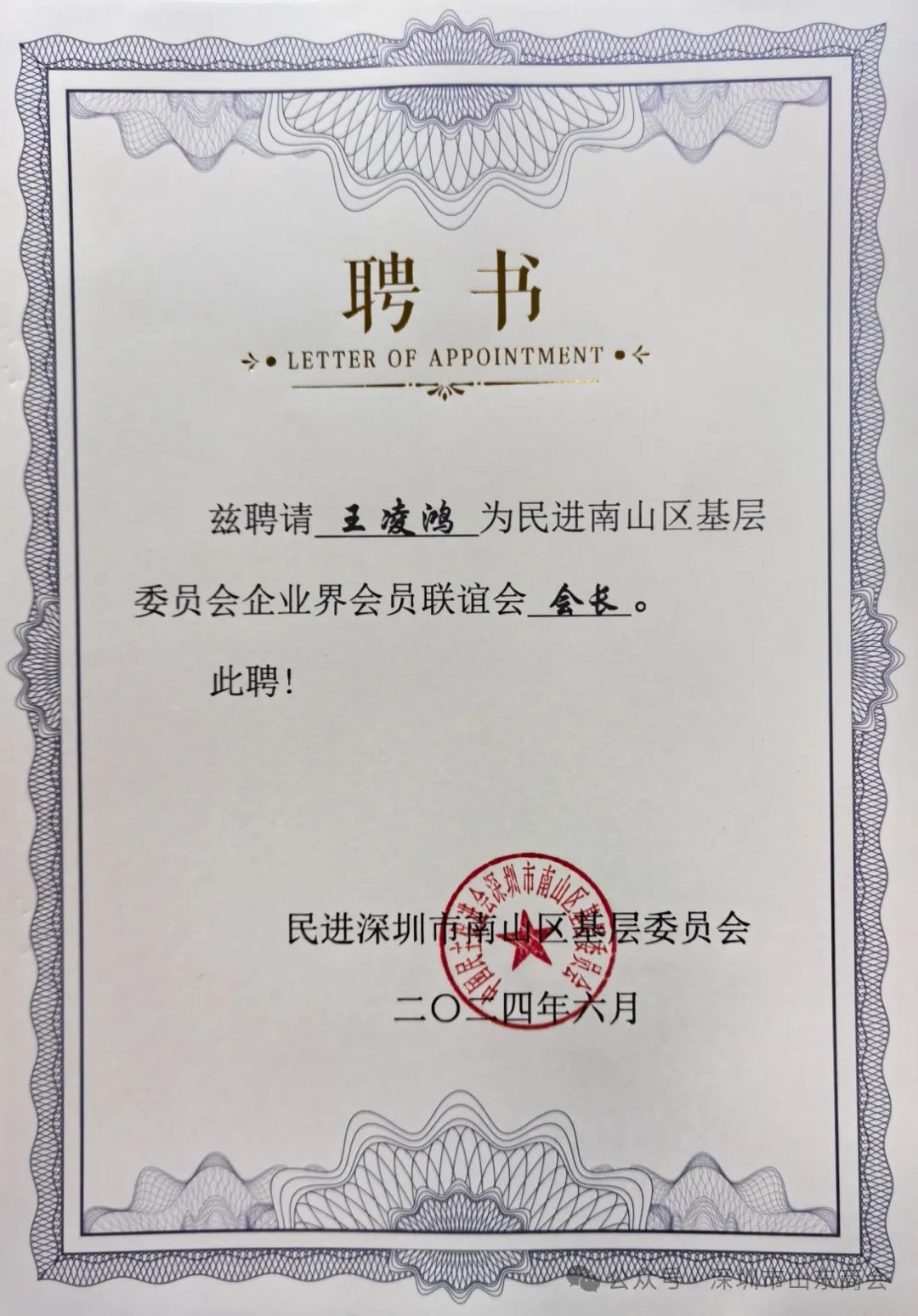 【會(huì)企動(dòng)態(tài)】熱烈祝賀我會(huì)執(zhí)行會(huì)長王凌鴻當(dāng)選“民進(jìn)南山區(qū)基層委員會(huì)企業(yè)界會(huì)員聯(lián)誼會(huì)”首任會(huì)長
