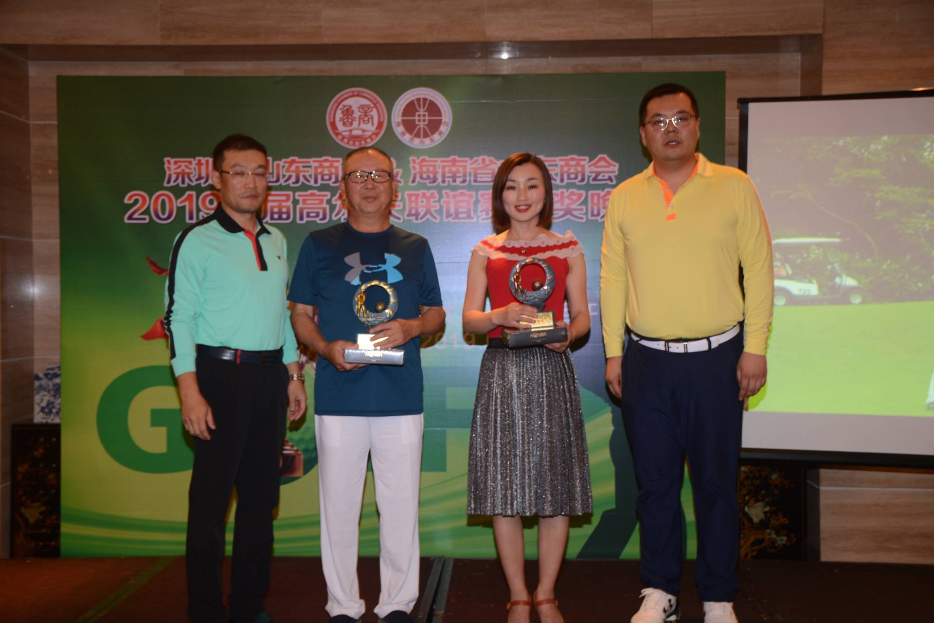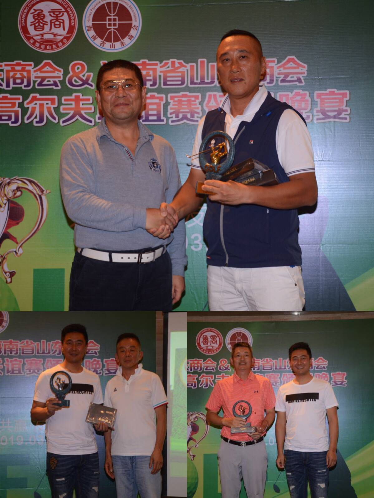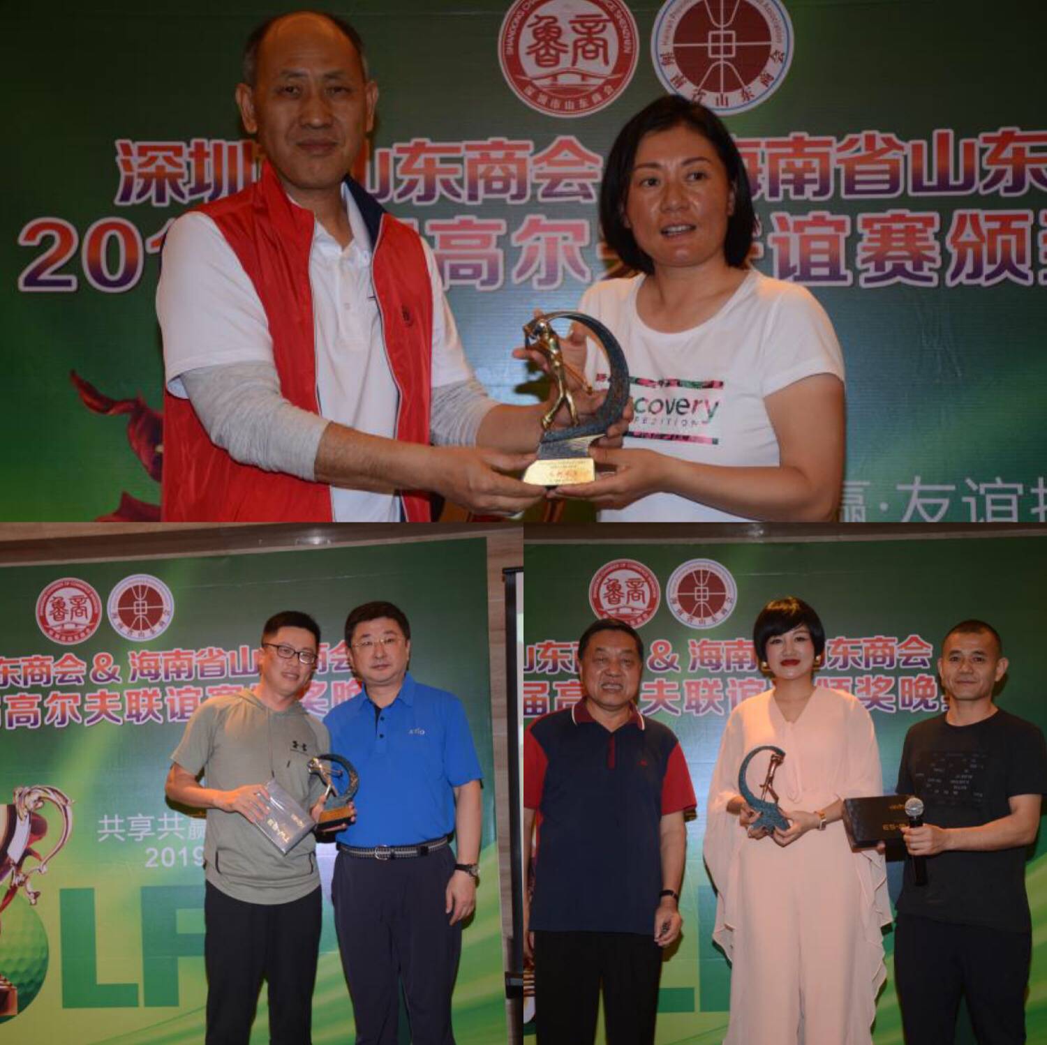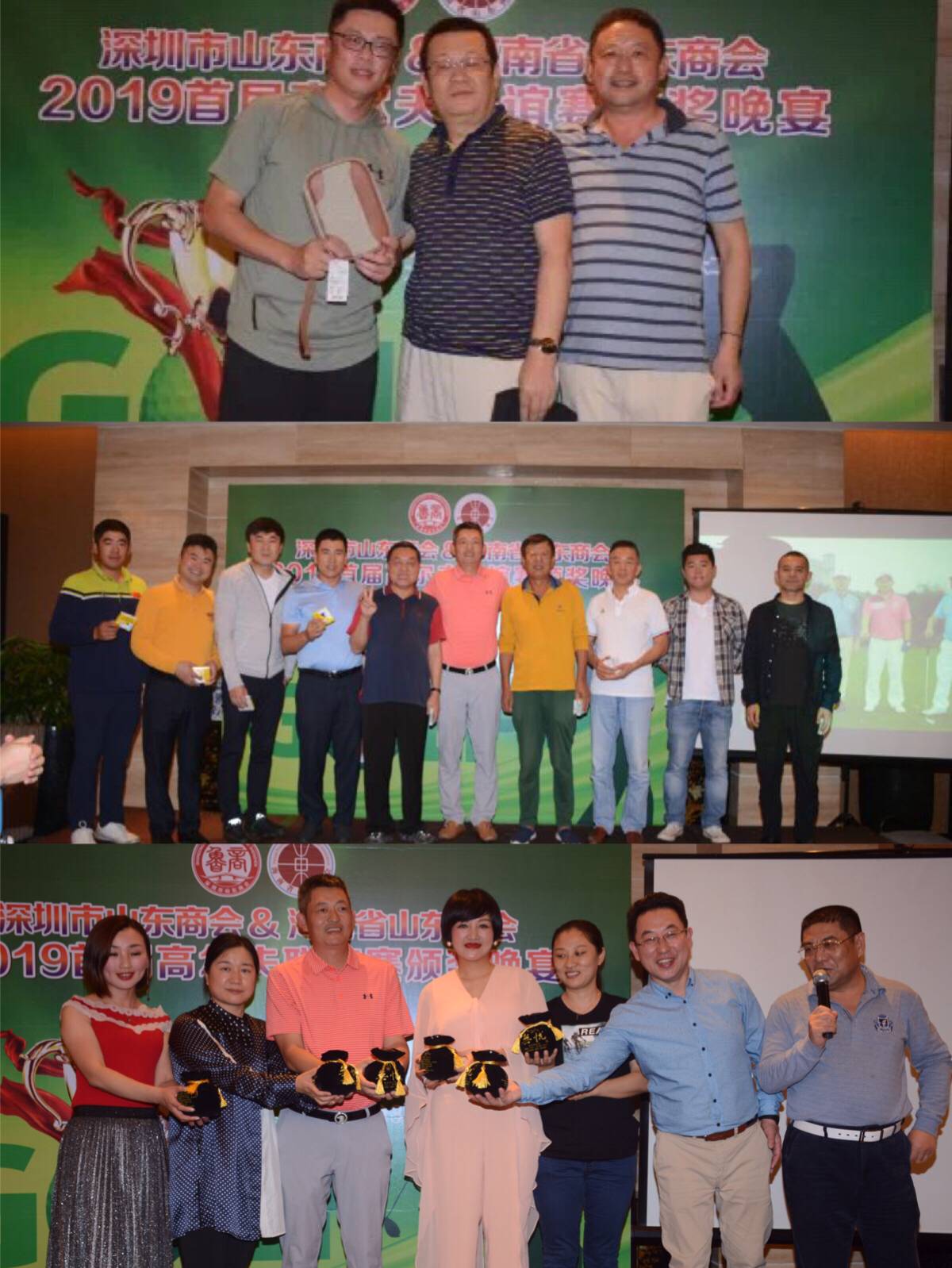頒獎(jiǎng)環(huán)節(jié),按照事先制定的聯(lián)誼賽規(guī)則,男士藍(lán)T、女士紅T、六十歲以上白T,獎(jiǎng)項(xiàng)設(shè)置:總桿冠亞季、凈桿冠亞季、最遠(yuǎn)距離、最近旗桿和團(tuán)隊(duì)獎(jiǎng),團(tuán)隊(duì)獎(jiǎng)雙方取總桿前六名記總成績(jī)。獲得總桿冠亞季軍的分別是譚玲玲、王強(qiáng)、譚蕊樂(lè);凈桿冠亞季軍的分別是弭奎、張廷峰、劉桂森;最遠(yuǎn)距離是賈培全;最近旗桿是于少霞;團(tuán)隊(duì)獎(jiǎng)由深圳市山東商會(huì)摘取。晚宴上分別給各位獲獎(jiǎng)?wù)哳C發(fā)了獎(jiǎng)杯和獎(jiǎng)品。